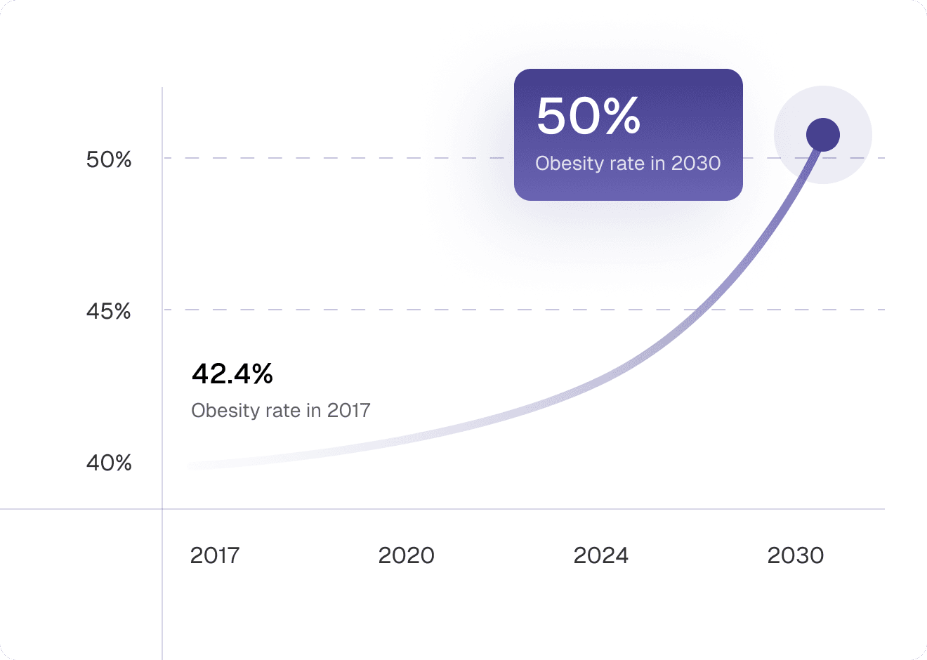 By 2030, nearly half of U.S. adults will be obese, including the nearly 1 in 4 who will have severe obesity. The obesity rate will surpass 50% in 29 states.